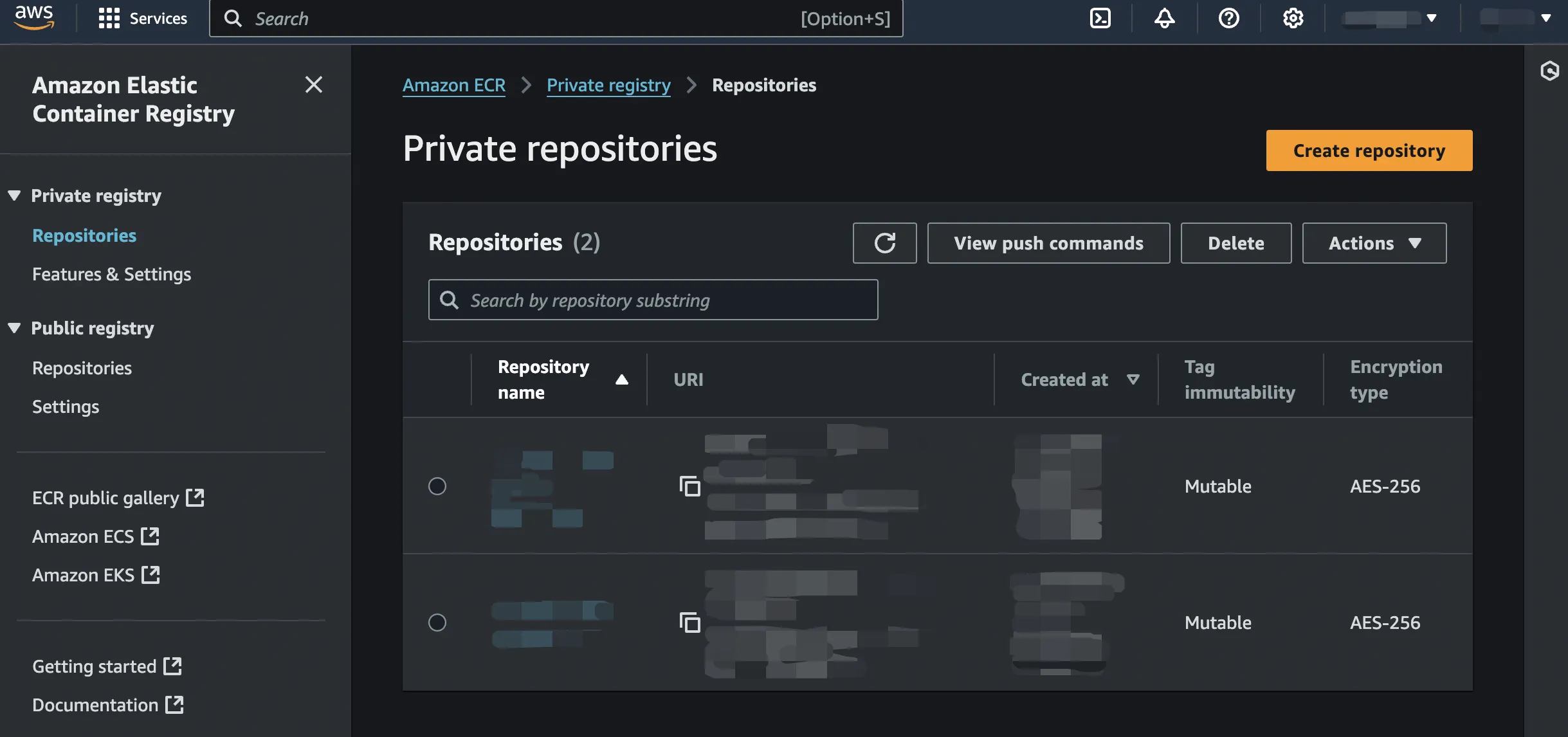 Enter the ECR console, you will see the following UI. Click Create repository and following the instructions.